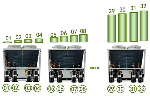 多級容量調(diào)節(jié):機組每個模塊采用多個獨 立冷媒回路設計,單機最大可實現(xiàn)0-25%-50%-75%-100%的多級容量調(diào)節(jié)。