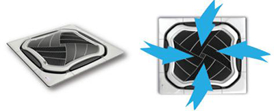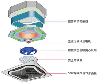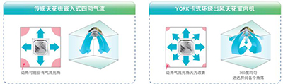 與平面回風(fēng)格柵相比,約克卡式天花室內(nèi)機(jī)(環(huán)形出風(fēng))獨有的球面回風(fēng)格柵具有更大的回風(fēng)面積,風(fēng)量大噪音低,在回風(fēng)氣流組織方面也更合理;同時更美觀大方。